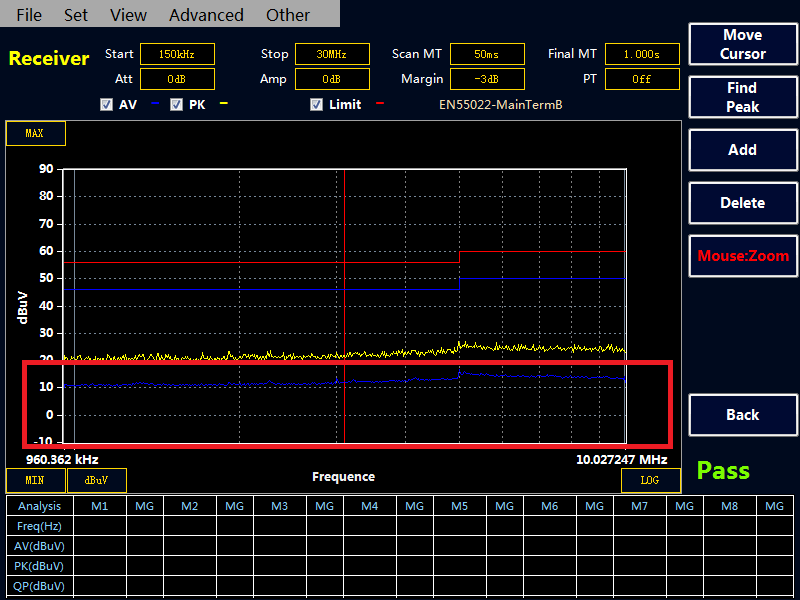在菜單欄中點(diǎn)擊 Advanced——Advanced option,將 Lock Final Test Frequency 選項(xiàng)勾上,點(diǎn)擊OK,回到主界面的超標(biāo)點(diǎn)的頻率那一欄顯示紅色,說明設(shè)置成功,然后添加自己需要的測試頻點(diǎn)。(在接收機(jī)掃描到 PK 值和 AV 值后,如果客戶需要一直關(guān)注的峰值點(diǎn)的頻率對應(yīng)的 PK,AV,QP 值,可以鎖定頻率點(diǎn),在下次終測時(shí),可以固定掃描自己需要的頻點(diǎn)。)
