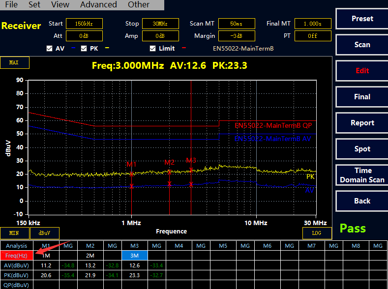 繪制 PK 曲線與繪制 QP 曲線方法相同。繪制完 PK 曲線點(diǎn) Save。然后 Exit 曲線標(biāo)準(zhǔn)繪制完畢。例如汽車電子 GB18655CISPR 25 L3 標(biāo)準(zhǔn)中有需要繪制 AV,QP,PK 三條曲線的。