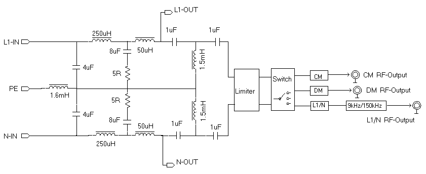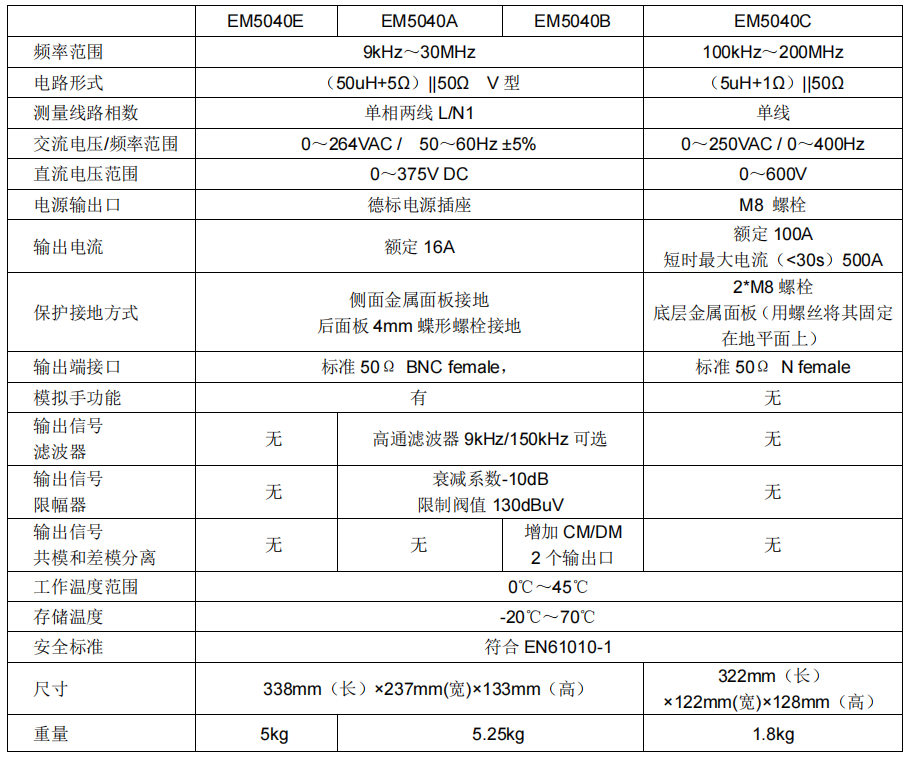 EM5040E/5040A/5040B 的 V 型人工電源網(wǎng)絡(luò)部分是完全相同的。所不同的是后續(xù)信號(hào)處理部分。EM5040E 只有基本的 V 型人工網(wǎng)絡(luò)部分。為了保護(hù)后級(jí)設(shè)備,推薦增加限幅器,可選用本公司EM5010A。