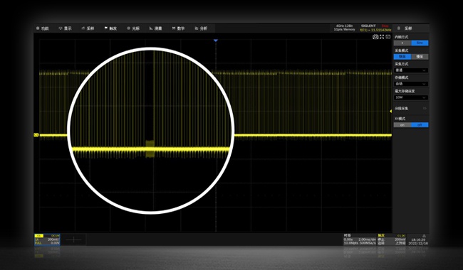 根據(jù)奈奎斯特采樣定律,為了保證采樣后的數(shù)字信號能完整復(fù)原真實(shí)信號的信息,一般實(shí)際應(yīng)用中需要保證采樣率為信號最高頻率的2.56~4倍。SDS7000A系列示波器的采樣率最高達(dá)20 GSa/s,是最高帶寬的5倍,能完美避免因采樣率不足而導(dǎo)致的信號失真。再搭配上最大1 Gpts/通道的長存儲深度,在長時間捕獲波形的同時,依然能使用更高的采樣率高保真捕獲波形,充分發(fā)揮4GHz帶寬性能。