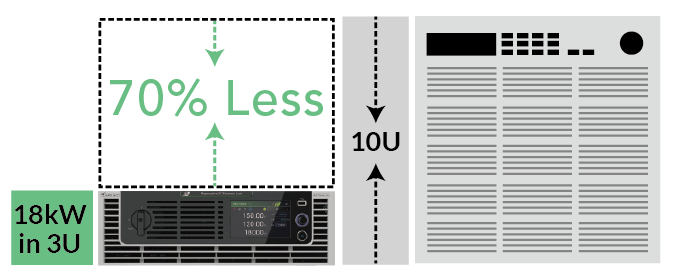 高功率密度設(shè)計,相同18kW的電子負載,可減少70%的體積,改善高功率電子負載體積大、移動不便的情況,能為實驗室節(jié)省不少空間。