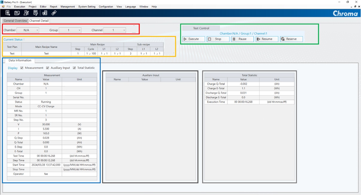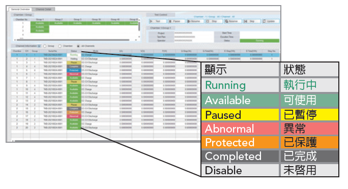 - 測試計劃執(zhí)行器畫面,圖像化狀態(tài)清楚顯示信道運行情況,大幅提升操作效率并縮短人員訓(xùn)練時間,提供高效且專業(yè)的電池測試體驗