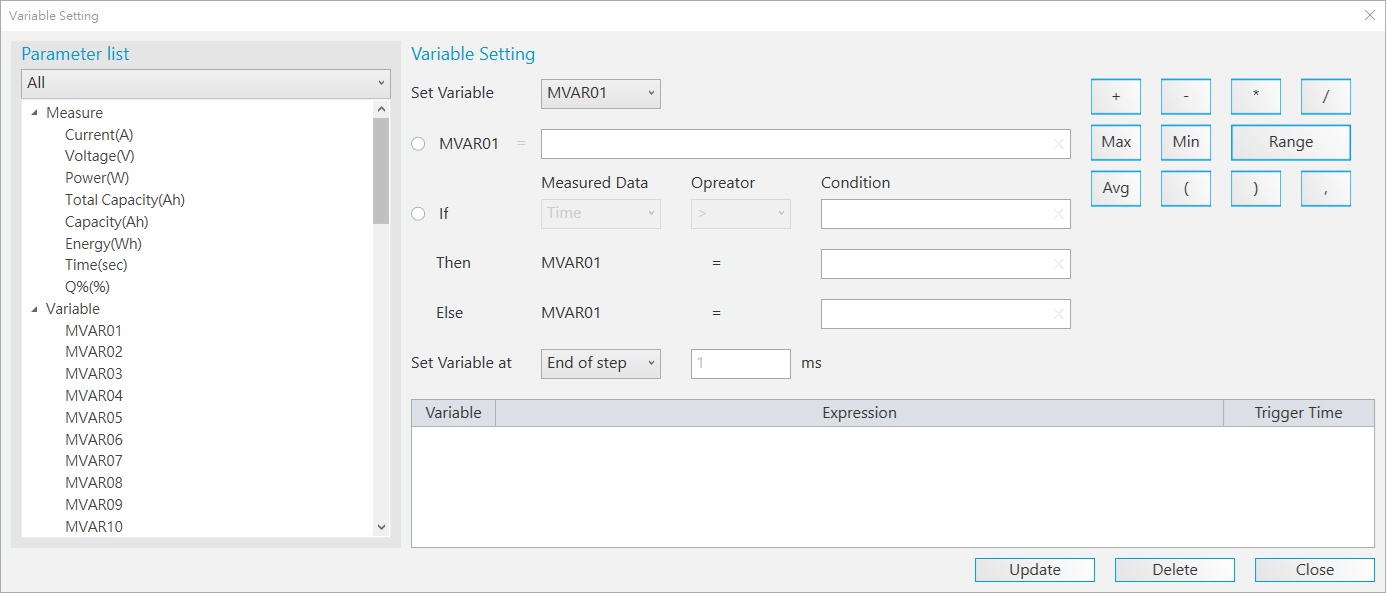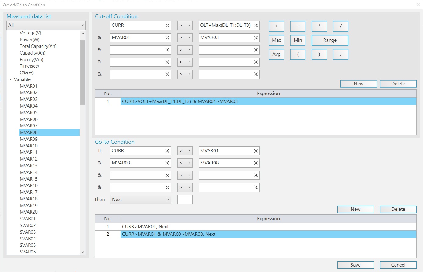 - 截止/跳轉(zhuǎn)條件:時間、電流、容量、截止電壓、截止電流或變量設(shè)定等方式,支持表達(dá)式與 If-Then-Else 規(guī)則,讓參數(shù)設(shè)定更靈活、符合測試驗證邏輯
