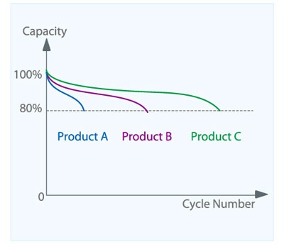 電池之充放電使用壽命不只是動(dòng)力電池需要,所有電池芯產(chǎn)品都有 相同之測(cè)試條件,其測(cè)試是依照評(píng)估者先行定義的充放電條件做為 一個(gè)周期,反復(fù)測(cè)試同一顆電池芯,評(píng)估此電池直到測(cè)試終止條件 到達(dá)前,正確地執(zhí)行過幾個(gè)周期,即為此電池之循環(huán)周期,而循環(huán) 周期次數(shù)愈多,代表此電池芯之壽命愈長(zhǎng)。進(jìn)而以同樣測(cè)試條件測(cè) 試不同種類的電池芯,來評(píng)估性能優(yōu)劣,或用來評(píng)估某一產(chǎn)品最適 合的充放電條件與使用條件。