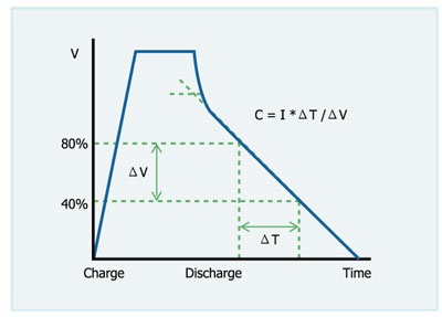 根據(jù)EDLC測(cè)試法規(guī)IEC 62391,在測(cè)試容量前,EDLC必需確定其 經(jīng)過CV充電程序并且已經(jīng)完成充電后,其容量測(cè)試是以上述放 電電流進(jìn)行CC放電,放電程序完成后,取放電曲線上EDLC之額 定電壓的80%電壓點(diǎn)及額定電壓的40%電壓點(diǎn),二點(diǎn)間的放電能 量與間距時(shí)間,來計(jì)算此EDLC的容量。